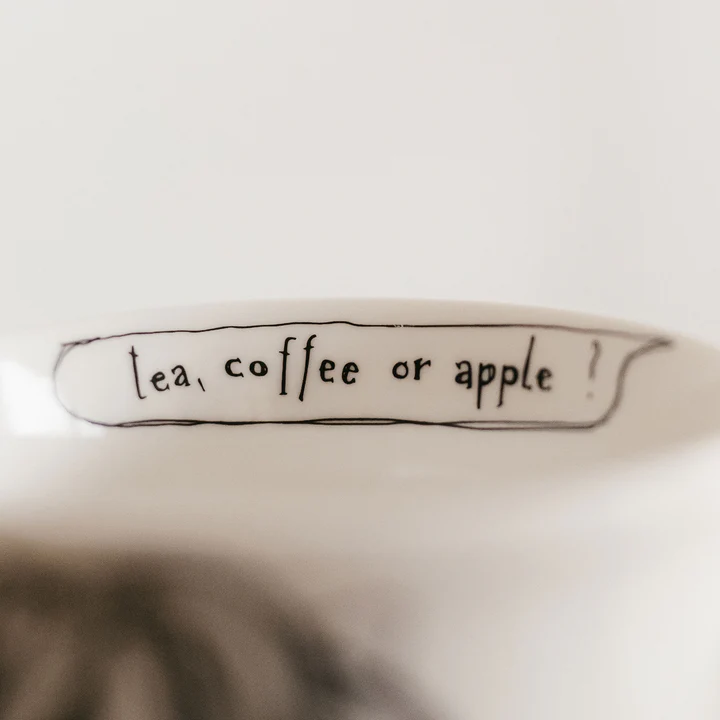 Gemaakt van hoogwaardig, duurzaam porselein dat volledig recyclebaar is. De mok is vaatwasmachinebestendig en geschikt voor magnetrongebruik, ideaal voor dagelijks gebruik. De gladde afwerking, verfijnde illustratie en subtiele humor maken dit een opvallend item voor aan tafel of op kantoor — een knipoog naar de verleiding van koffie en kennis.